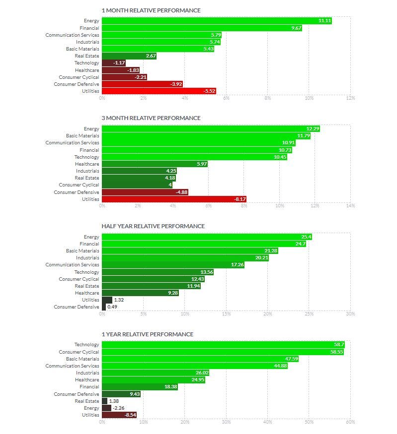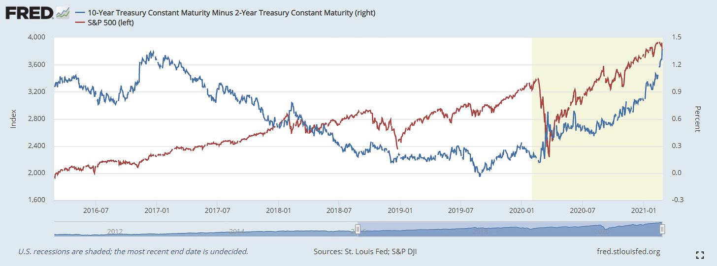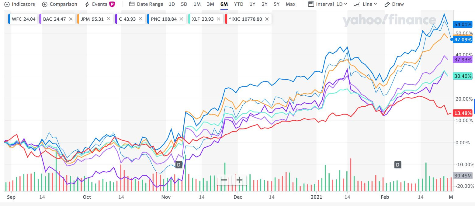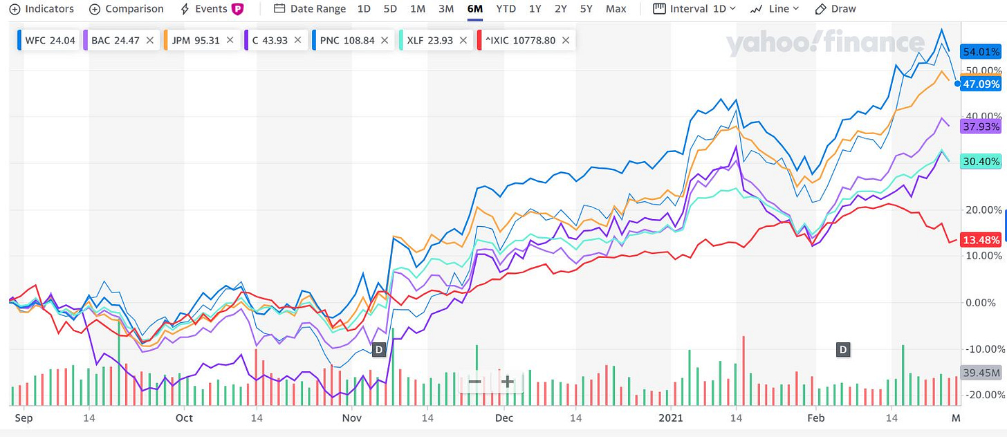 Keep in mind the financial sector has been a laggard as tech has benefitted from low interst rates. Financial institutions benefit more from higher interest rates (or speculation of higher rates to come) as we can see here: