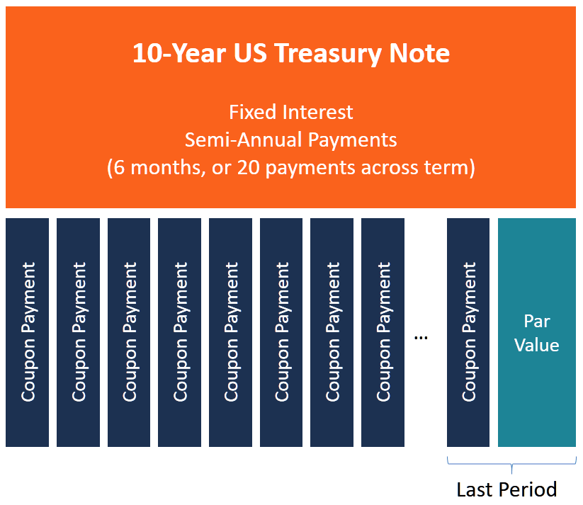 In this example of a 10 year Treasury Note, interest is paid every six months. This means you give your investment to the US Government and every six months they pay you a set interest payment. The last payment is interest plus your investment.